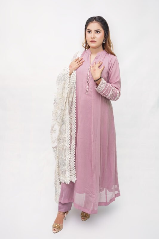 Lilac khadi 3-piece shalwar suit featuring heavy embroidery with sequins on the neckline, sleeves, and daman. Paired with a plain trouser with stitch design and embroidered net dupatta.