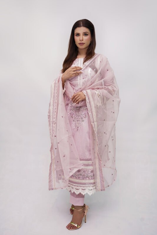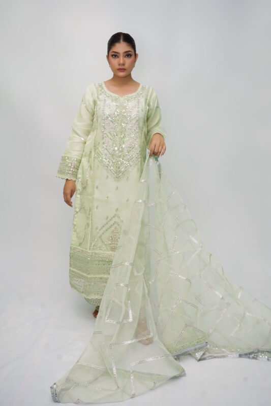 Zinc chiffon 3-piece shalwar suit featuring full heavy embroidery with sequins and cutwork. Comes with a silk trouser and chiffon dupatta with embroidered borders and corner detailing.