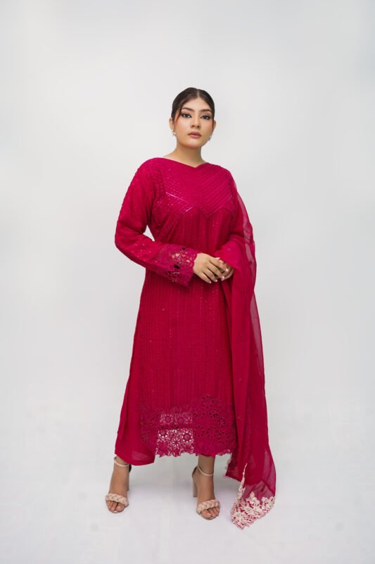 3-piece chiffon short frock set in vibrant shocking pink