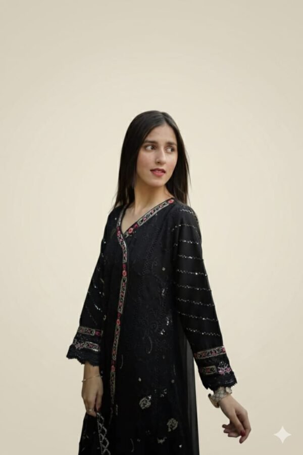 3-Piece Arabic Lawn Suit – Timeless Black with Multicolor Embroidery & Chiffon Dupatta