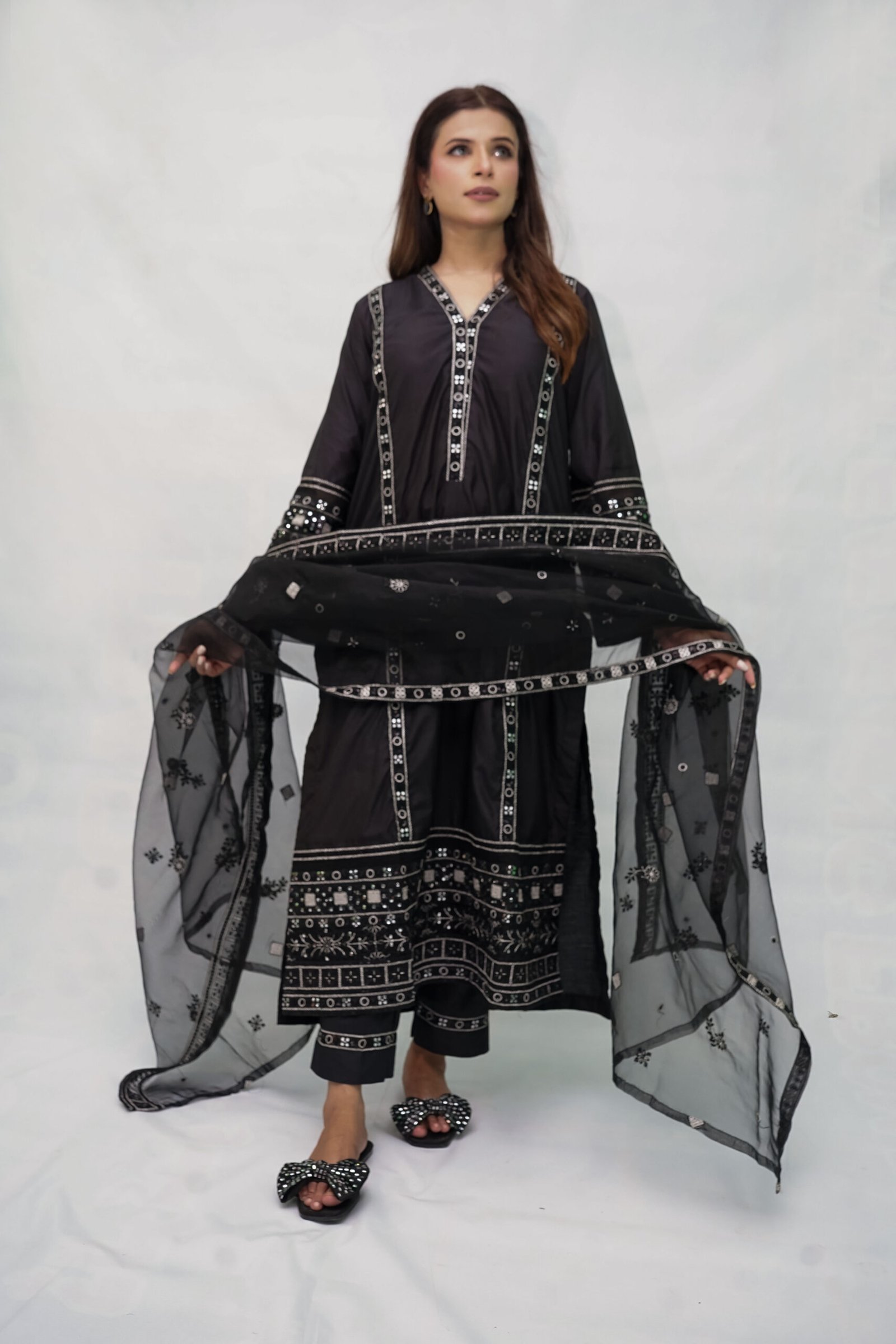 Black khadi 3-piece suit featuring an embroidered long shirt with sequins, trouser with embroidered border, and fully embroidered organza dupatta.