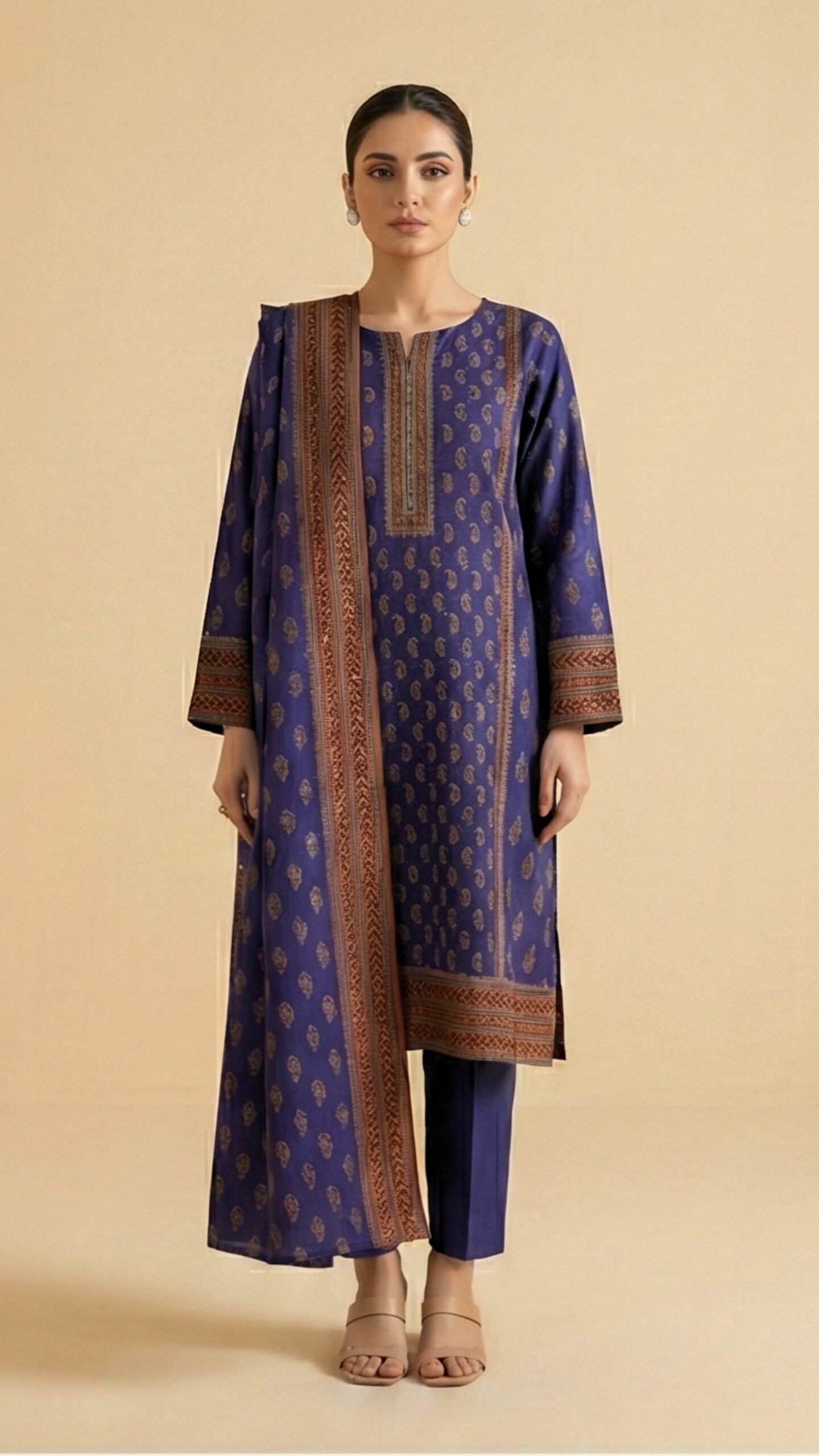 Refresh your winter wardrobe with this elegant 3-Piece Dhanak suit by Vogue Studio, designed in a calming blue shade that reflects effortless style and seasonal comfort.