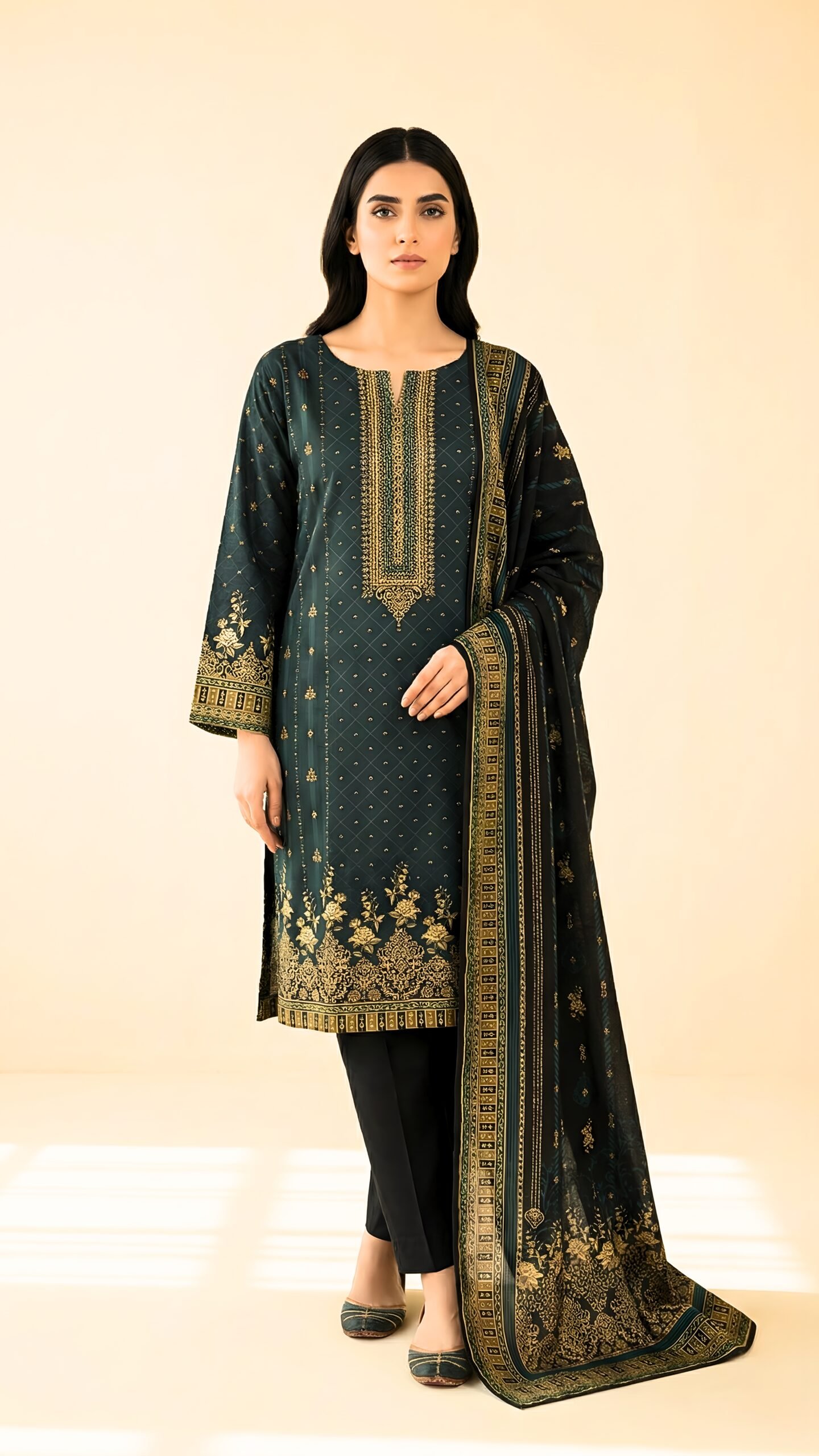 The printed linen shirt adds subtle texture and visual depth, while the plain trouser maintains a clean, balanced silhouette. Completing the ensemble is a matching printed Banadora dupatta, bringing fluid movement and a polished finish to the overall look.