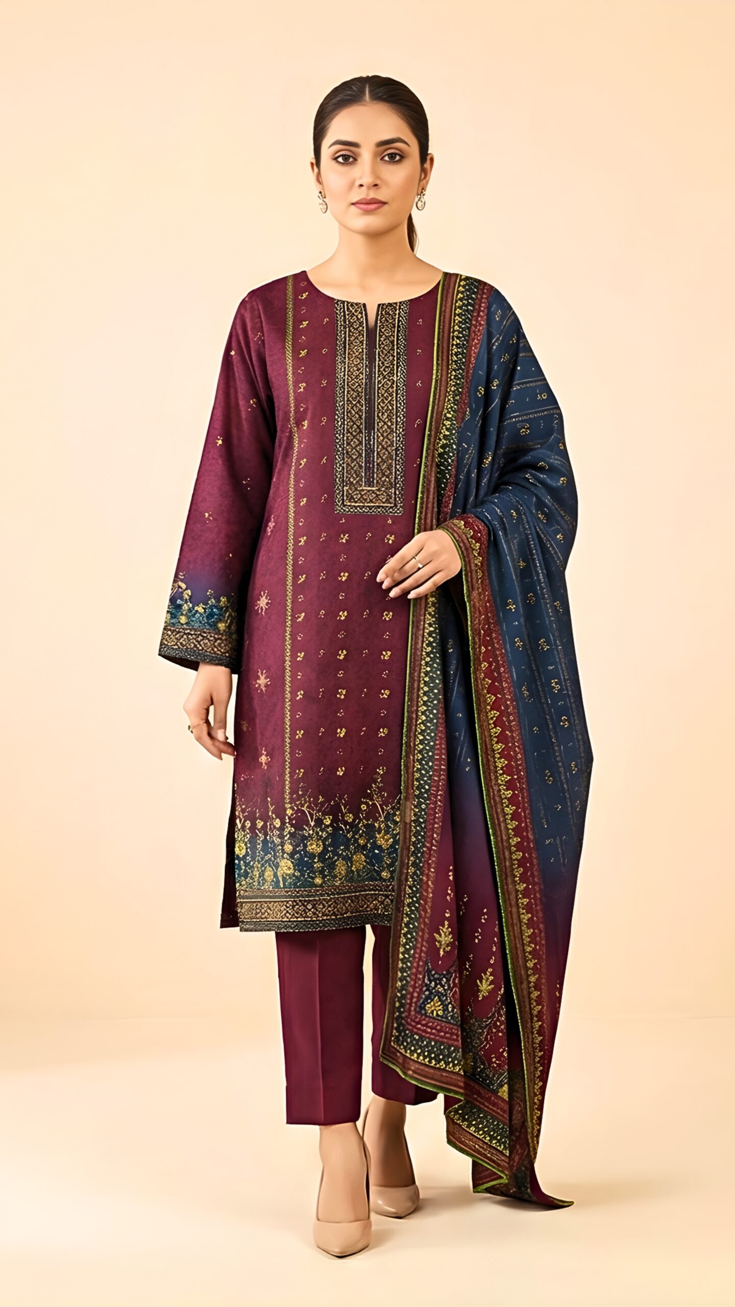 Elevate your seasonal wardrobe with this beautifully designed 3-Piece Khadar suit by Vogue Studio, crafted in a deep maroon shade that reflects warmth, elegance, and timeless sophistication.