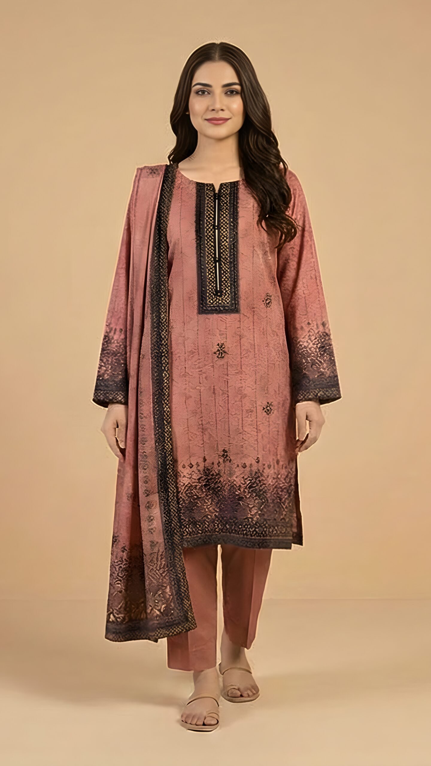 Add a touch of feminine charm to your winter wardrobe with this beautifully designed 3-Piece Khadar suit by Vogue Studio, crafted in a graceful pink shade that reflects warmth and elegance.