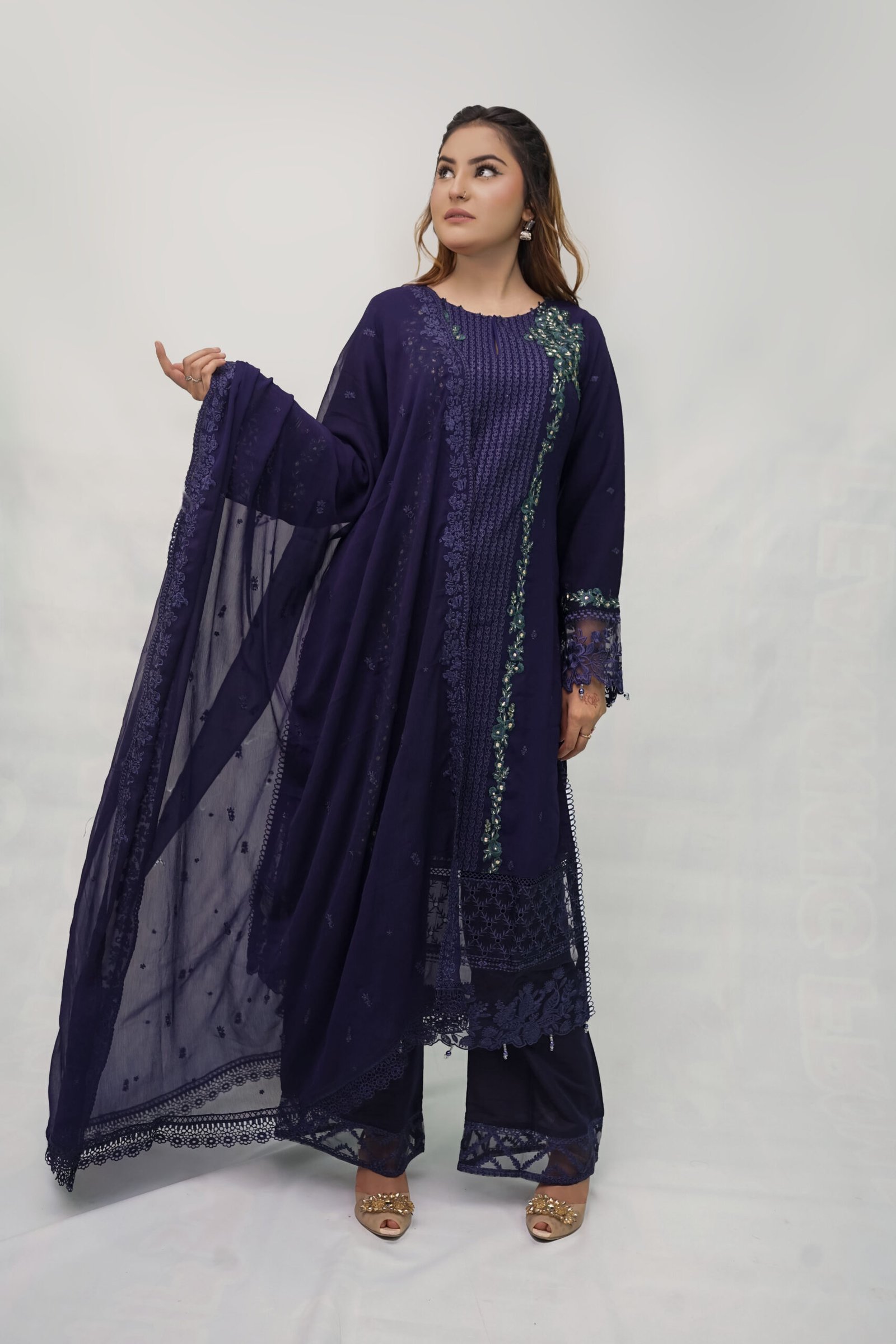 Elevate your festive look with this stunning purple 3-piece chiffon shalwar suit. The chiffon shirt comes fully embellished on the front with matching and green embroidery, finished with elegant tussles on the daman and sleeves for a stylish touch.