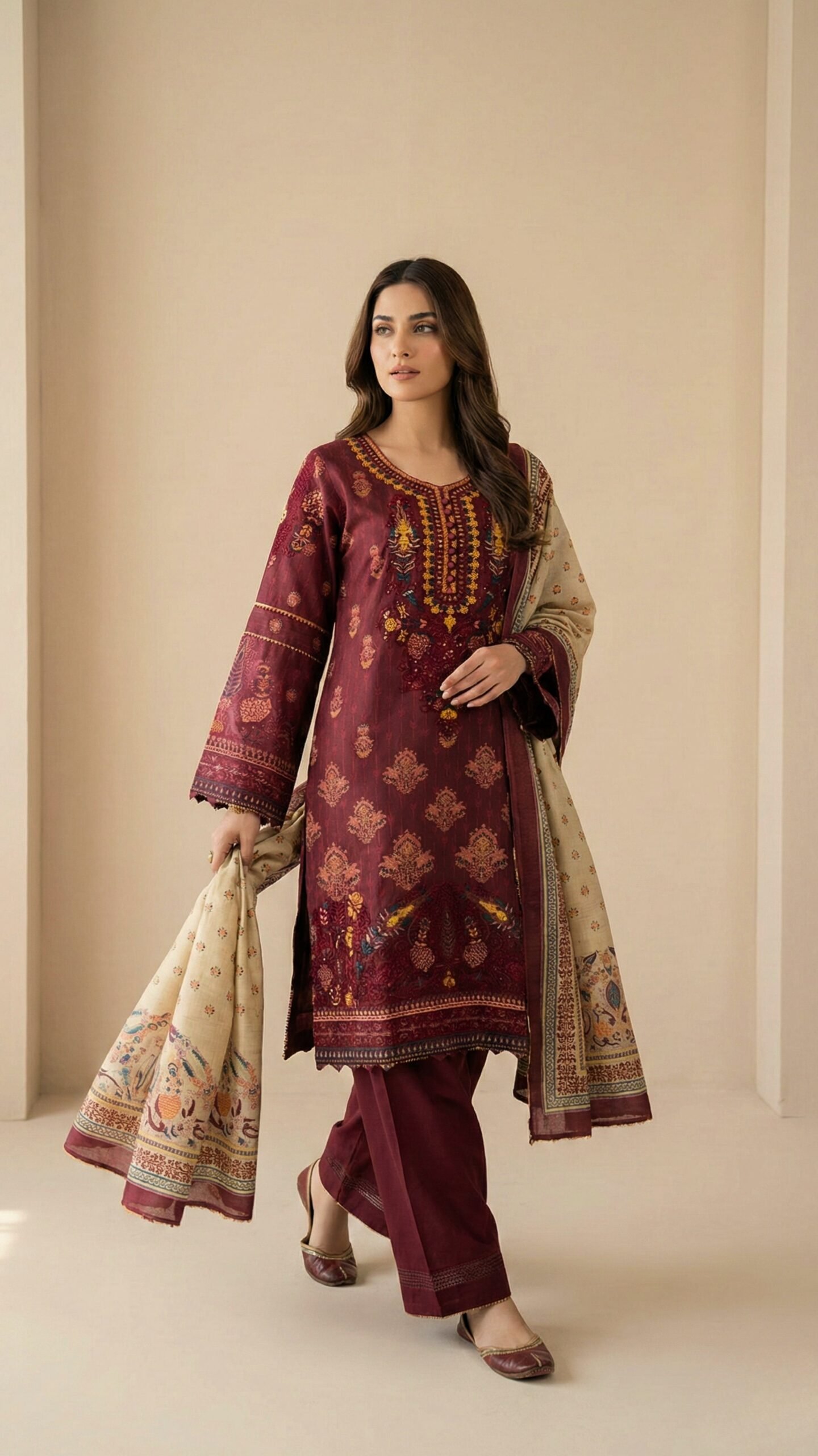 Step into refined winter luxury with this exquisitely crafted 3-Piece Dhanak suit by Vogue Studio. Designed in a classic black palette, this ensemble blends traditional craftsmanship with contemporary sophistication.