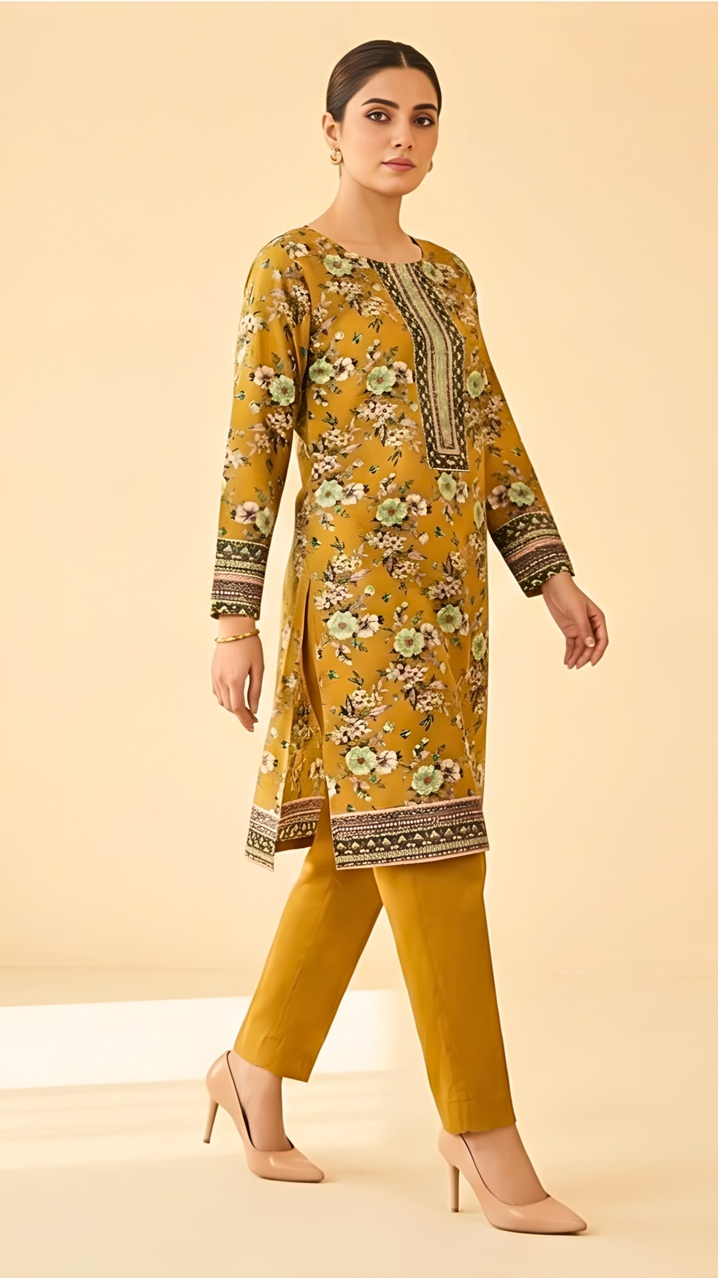 The printed linen shirt adds subtle pattern detailing, while the plain trouser keeps the silhouette clean and balanced. Completing the look is a matching printed Banadora dupatta, adding fluidity, charm, and a refined finishing touch.