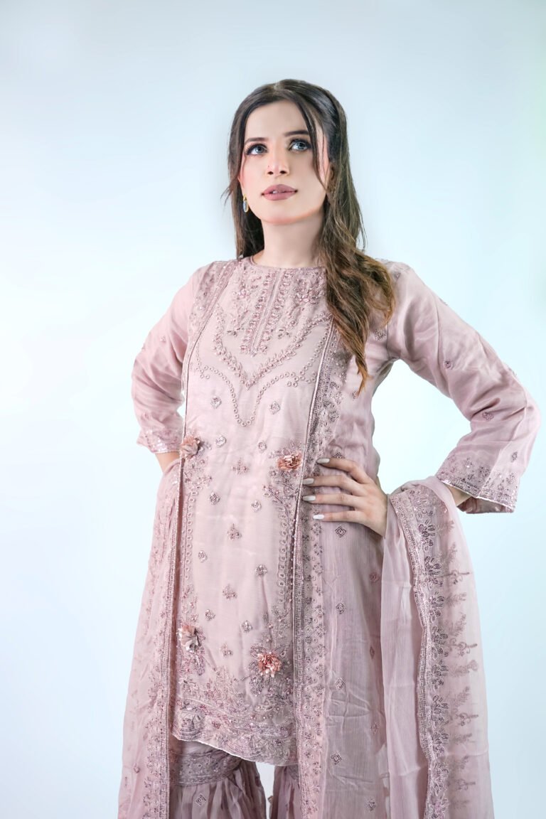 Tea Pink 3-Piece Chiffon Gharara Set with 3D Flowers & Embellished Dupatta